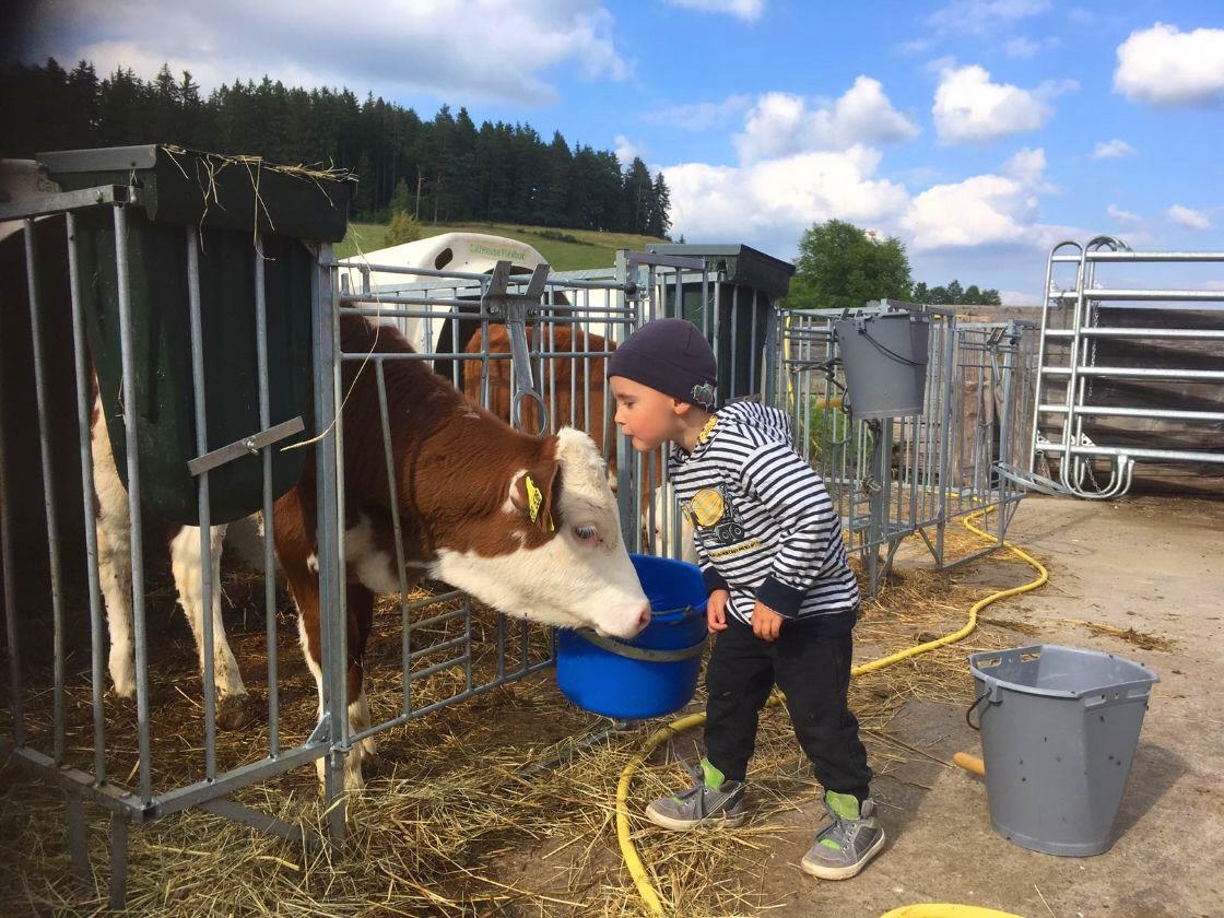 - Kühe, Rinder, Kälber, Ziegen, Pony, Hasen, Meerschweinchen, Katzen und Hund sind zu versorgen. Nach getaner Arbeit gibt's frische Milch von der Kuh und frische Eier von glücklichen Hühnern.